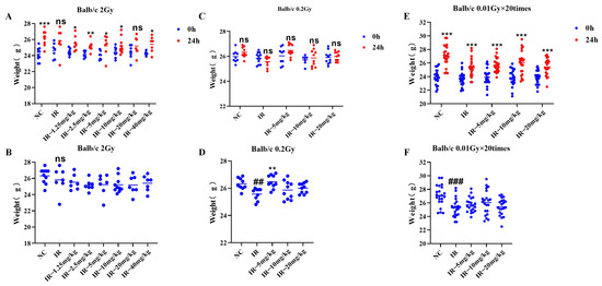 Changes in mouse body weight under different irradiation conditions caused by silybin: (A,B) single 2 Gy irradiation; (C,D) single 0.2 Gy irradiation; (E,F) multiple low-dose irradiation of 0.01 Gy × 20 times. Panels (A,C,E) show the mouse body weights before and after 24 h of irradiation, and panels (B,D,F) show the mouse body weights after 24 h of irradiation. For n ≥ 3, Data are presented as mean ± SEM. ## p < 0.01; ### p < 0.001; * p < 0.05; ** p < 0.01; *** p < 0.001; ns p > 0.05.