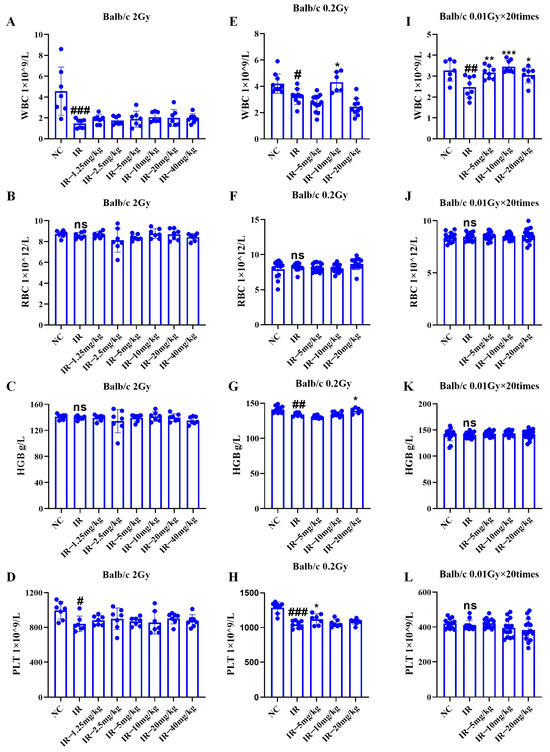 Changes in the blood profile of mice under different irradiation conditions caused by silybin: (A–D) single 2 Gy irradiation; (E–H) single 0.2 Gy irradiation; (I–L) multiple low-dose irradiation of 0.01 Gy × 20 times. n ≥ 3. Data are presented as mean ± SEM. # p < 0.05; ## p < 0.01; ### p < 0.001; * p < 0.05; ** p < 0.01; *** p < 0.001; ns p > 0.05.