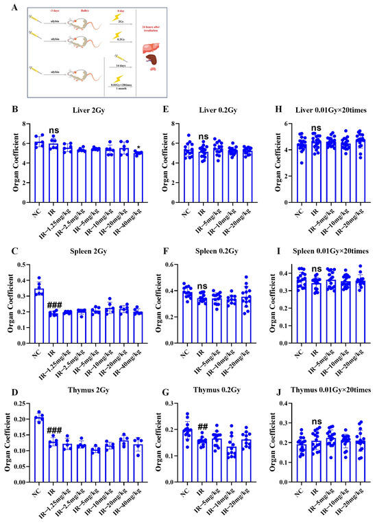 Changes in the organ coefficients of immune organs in mice under different irradiation conditions in response to silybin. (A) Flowchart of the experimental design for mice receiving tissues (liver, spleen, and thymus); (B–D) single 2 Gy irradiation; (E–G) single 0.2 Gy exposure; (H–J) multiple low-dose exposures of 0.01 Gy × 20 times. n ≥ 3. Data are presented as mean ± SEM. ## p < 0.01; ### p < 0.001; ns p > 0.05.