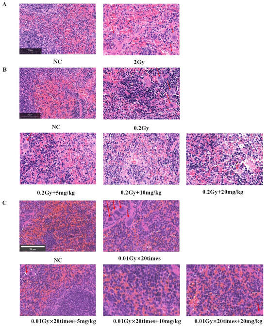 Silybin effects on mouse spleen HE staining under varied irradiation conditions: (A) 2 Gy; (B) 0.2 Gy, silybin intervention concentration 5/10/20 mg/kg; (C) 0.01 Gy × 20 times, silybin intervention concentration 5/10/20 mg/kg. The red arrows indicate inflammatory cell infiltration. Magnification 40×, scale 50 μm and 20 μm.