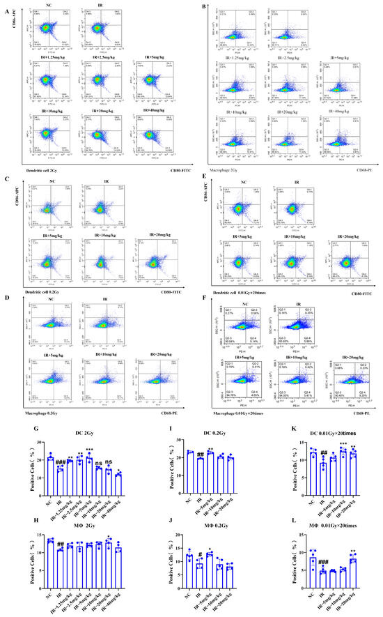 Alterations in the number of splenic immune cells in mice subjected to distinct irradiation conditions caused by silybin: (A,B,G,H) 2 Gy; (C,D,I,J) 0.2 Gy; (E,F,K,L) 0.01 Gy × 20 times. n ≥ 3. Data are presented as mean ± SEM. # p < 0.05; ## p < 0.01; ### p < 0.001; * p < 0.05; ** p < 0.01; *** p < 0.001; ns p > 0.05.