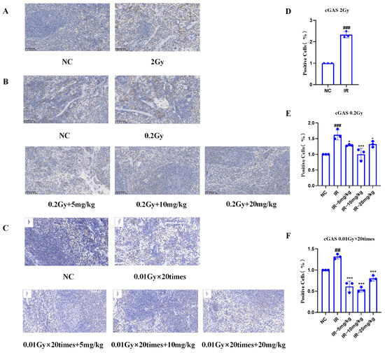 Immunohistochemistry of splenic cGAS proteins in mice subjected to different irradiation conditions via silybin: (A,D) 2 Gy; (B,E) 0.2 Gy; (C,F) 0.01 Gy × 20 times. Magnification 40×, scale 50 μm and 20 μm. n ≥ 3. Data are presented as mean ± SEM. ## p < 0.01; ### p < 0.001; * p < 0.05; *** p < 0.001.
