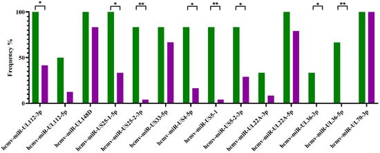 HCMV miRNA detection rates in lytic and latent infections. The y axis displays the observed frequencies, and the x axis shows the fourteen HCMV-encoded miRNAs analyzed. Lytic infections are displayed in green, while latent infection is shown in purple. Significant differences in the miRNA frequencies between the two groups are reported with * p < 0.05 and ** p < 0.001.