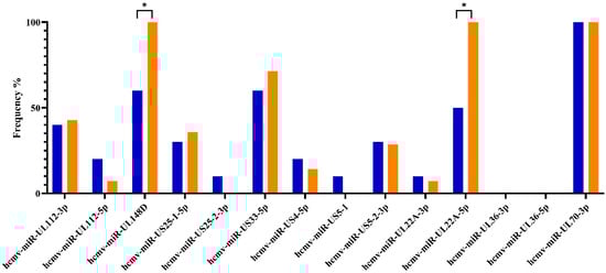 HCMV miRNA detection rates in subjects with HCMV only and those with HIV coinfection. The y axis displays the percentages of the observed frequencies; the x axis shows the fourteen HCMV-encoded miRNAs analyzed. HCMV monoinfections are represented in blue, while HCMV/HIV coinfections are in orange. Significant differences in the miRNA frequencies between the two groups are reported with * p < 0.05.