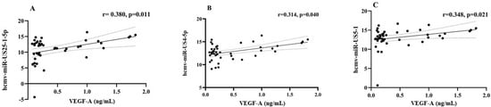 The relationship between the expression of HCMV-encoded miRNAs, which are commonly observed during lytic infection, and VEGF-A plasma levels. The correlation between the hcmv-miR-US25-1-5p expression levels and VEGF-A plasma concentrations in HCMV lytic infection (Panel A). The correlation between the hcmv-miR-US4-5p expression levels and VEGF-A plasma concentrations in HCMV lytic infection (Panel B). The correlation between hcmv-miR-US5-1 and VEGF-A plasma concentrations in HCMV lytic infection (Panel C). In all panels, the solid line corresponds to the linear regression line fitted to the data, while the dotted lines represent the 95% confidence interval of the regression line. Moreover, the varying hcmv-miR expression levels are presented as ΔCt, normalized to the amplification of the endogenously expressed hsa-miR-6090.