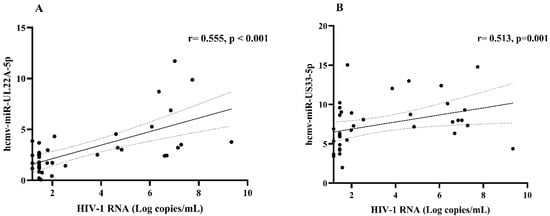 In latently HCMV/HIV-coinfected subjects, hcmv-miR-22A-5p and hcmv-miR-US33-5p expression levels significantly correlated with HIV-1 RNA (r = 0.555, p < 0.001 and r = 0.513, p = 0.001, respectively (Figure 4A and B)). These correlations were confirmed with FDR correction (p = 0.001; p = 0.002, respectively). Additionally, hcmv-miR-UL22A-5p expression showed significant positive correlations with IP-10 plasma (r = 0.435, p = 0.006, FDR-adjusted p value = 0.009) and hcmv-miR-UL148D with VEGF (r = 0.324. p = 0.044. FDR-adjusted p value = 0.132) (Figure 5A,B). All FDR-adjusted p values are reported in Supplementary Table S1B.