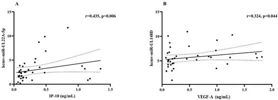 Correlation between HCMV-encoded miRNAs and inflammatory cytokine plasma levels in latently HCMV/HIV-coinfected subjects. Correlations between hcmv-miR-UL22A-5p and IP-10 plasma levels (Panel A). Correlations between hcmv-miR-UL148D and VEGF-A plasma levels (Panel B). In all panels, the solid line corresponds to the linear regression line fitted to the data, while the dotted lines represent the 95% confidence interval of the regression line. Moreover, varying hcmv-miR expression levels are presented as ΔCt, normalized to amplification of endogenously expressed hsa-miR-6090.