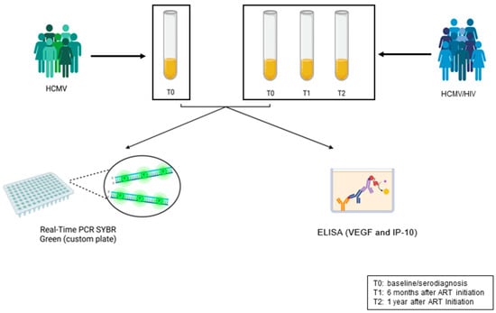 Sixteen individuals with AHI from the National Institute for Infectious Diseases (INMI) observational cohort of primary infection (SIREA cohort), who tested positive for HCMV (IgG anti-HCMV-positive), were evaluated at the time of HIV diagnosis (T0) and after 6 (T1) and 12 months (T2) of early antiretroviral therapy (initiated within seven days from serodiagnosis) (Figure 6). At these times, both HIV and HCMV viremia were evaluated. As a control group, 14 subjects who tested positive only for HCMV serology were included. HCMV IgG levels were quantified with LIAISON® kits on LIAISON® XL (DiaSorin, Saluggia, VC, Italy). The serodiagnosis of AHI subjects was posed based on either the combination of an HIV Ab/Ag Combo positive (Abbott ALINITY HIV Ag/Ab Combo assay, Abbott Park, IL, USA) and an Immuno Blot (Geenius, BioRad, Bio-Rad Laboratories S.r.l., Milan, Italy) negative assay with positive HIV-1 RNA or an HIV Ab/Ag Combo positive and Immuno Blot indeterminate assay, according to WHO criteria for Western blot confirmatory assay, i.e., two Env-reactive bands. Plasma HIV-1 RNA was measured by Aptima™ HIV-1 Quant Dx Assay (Hologic, Inc., San Diego, CA, USA). All subjects were also tested for HCV Ab and HBsAg/anti-HBV core antigen determinations using ALINITY I HCVAb, HBsAg qualitative, and HBc tot RGT, respectively (Abbott Diagnostics, Chicago, IL, USA). HCMV DNA evaluation was performed on whole blood by HCMV ELITE MGB on the ELITe InGenius Instrument (ELITech Group S.p.A, Turin, Italy). The SIREA study was approved by the INMI Ethical Committee on 18 February 2014, while control samples were residuals of diagnostic evaluations (Ethical Committee, CET Lazio area 4 approval number 61/2023, 4 December 2023). All subjects were requested to sign an informed consent form.