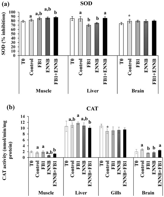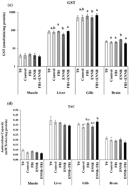 Antioxidant enzymes activity. (a) SOD, % inhibition; (b) CAT, nmol/min/mg protein; (c) GST, nmol/min/mg protein; (d) TAC, mM Trolox/mg protein) in the muscle, liver, gills, and brain of juvenile S. aurata (average ± standard deviation; n = 6) before (T0) and after 28 days of exposure to the different experimental aquafeeds. Different letters (a–c) indicate significant differences between the treatments at day 28 (ANOVA or Kruskal–Wallis; p < 0.05). Asterisks (*) indicate significant differences between T0 and CTRL (t test or Mann–Whitney; p < 0.05). Abbreviations: T0—initial sampling point (at day 0); CTRL—control; FB1—fumonisin B1; ENNB—enniatin B.