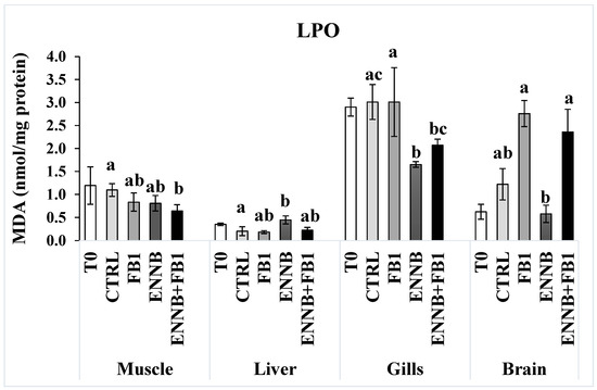 Lipid peroxidation (LPO) expressed by MDA concentration (nmol/mg protein) in the muscle, liver, gills, and brain of juvenile S. aurata (average ± standard deviation; n = 6) before (T0) and after 28 days of exposure to the different experimental aquafeeds. Different letters (a–c) indicate significant differences between the treatments at day 28 (ANOVA or Kruskal–Wallis; p < 0.05). Abbreviations: T0—initial sampling point (at day 0); CTRL—control; FB1—fumonisin B1; ENNB—enniatin B.