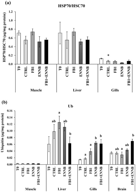 (a) Heat shock proteins (HSP70/HSC70; µg/mg protein) and (b) total ubiquitin concentration (Ub; µg/mg protein) in the muscle, liver, gills, and brain of juvenile S. aurata (average ± standard deviation; n = 6) before (T0) and after 28 days of exposure to the different experimental aquafeeds. Different letters (a,b) indicate significant differences between the treatments at day 28 (ANOVA or Kruskal–Wallis; p < 0.05). Asterisks (*) indicate significant differences between T0 and CTRL (t test or Mann–Whitney; p < 0.05). Abbreviations: T0—initial sampling point (at day 0); CTRL—control; FB1—fumonisin B1; ENNB—enniatin B.