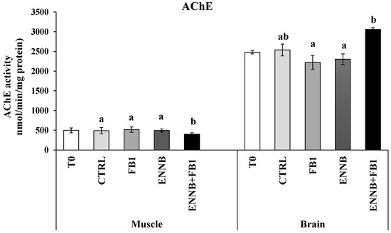 Acetylcholinesterase (AChE) activity (nmol/min/.mg protein) in the muscle and brain of juvenile S. aurata (average ± standard deviation; n = 6) before (T0) and after 28 days of exposure to the different experimental aquafeeds. Different letters (a,b) indicate significant differences between the treatments at day 28 (ANOVA or Kruskal–Wallis; p < 0.05). Abbreviations: T0—initial sampling point (at day 0); CTRL—control; FB1—fumonisin B1; ENNB—enniatin B.