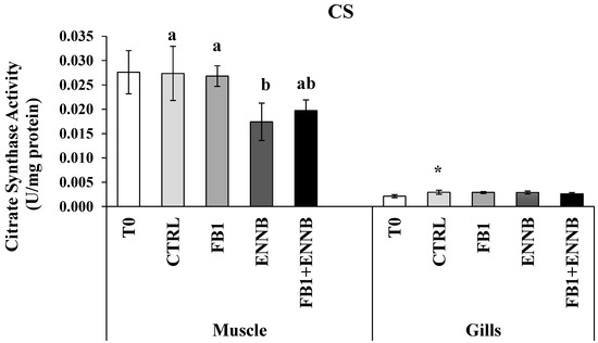 Citrate synthase activity (U/mg protein) in the muscle and gills of juvenile S. aurata (average ± standard deviation; n = 6) before (T0) and after 28 days of exposure to the different experimental aquafeeds. Different letters (a,b) indicate significant differences between the treatments at day 28 (ANOVA or Kruskal–Wallis; p < 0.05). Asterisks (*) indicate significant differences between T0 and CTRL (t test or Mann–Whitney; p < 0.05). Abbreviations: T0—initial sampling point (at day 0); CTRL—control; FB1—fumonisin B1; ENNB—enniatin B.