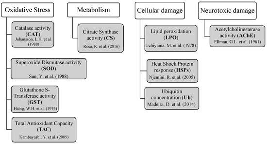 Biomarkers of oxidative stress, aerobic metabolism, and cellular and neurotoxic damage assessed to investigate toxicological responses in gilthead seabream exposed to mycotoxins through aquafeed [84,85,86,87,88,89,90,91,92].