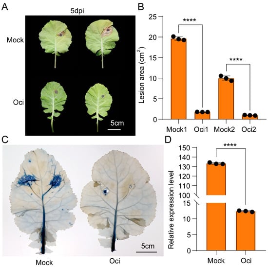 β-ocimene treatment enhanced the resistance of 98C40 to S. sclerotiorum infection and Spodoptera litura feeding. (A) Representative photos of the leaves infected by S. sclerotiorum. (B) Quantification of the lesion area on the leaves. (C) Quantification of cell necrosis by trypan blue staining. (D) Quantification of pathogen DNA in the area adjacent to 9 mm mycelium agar block leaves at 5 dpi by quantitative real-time PCR (qPCR). Mock: control group; Oci treated group; scale bar: 5 cm. Student’s t test was used to determine the significant difference; the symbols **** indicate significant differences at the p < 0.0001 level. Error bars represent SD.