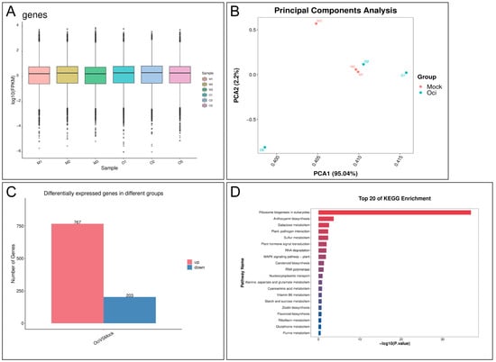 The fifth leaves from normal 98C40 were used for transcriptomic profiling. The treated group was labeled as Oci, and the control group was labeled as Mock. Three plants were randomly selected from each group, rapidly frozen in liquid nitrogen, and stored at −80 °C for later use. RNA was extracted from the samples using TRIzol® (Thermo Fisher, 15596018) according to the manufacturer’s instructions. The quantity and purity of the total RNA were assessed using a NanoDrop ND-1000 (NanoDrop, Wilmington, DE, USA), and RNA integrity was evaluated with a Bioanalyzer 2100 (Agilent, Santa Clara, CA, USA). The samples with a concentration > 50 ng/μL, RIN value > 7.0, and total RNA > 1 μg were used for downstream experiments. Poly(A)+ mRNA was captured by oligo(dT) magnetic beads (Dynabeads Oligo (dT), cat.25-61005, Thermo Fisher, Waltham, MA, USA) through two rounds of purification. The captured mRNA was fragmented at high temperature using a magnesium ion fragmentation kit (NEBNextR Magnesium RNA Fragmentation Module, cat.E6150S, Ipswich, MA, USA), generating a library with fragment sizes of 300 bp ± 50 bp (strand-specific library). Finally, the library was sequenced using the Illumina NovaSeqTM 6000 (LC Bio Technology Co., Ltd., Hangzhou, China) with a paired-end sequencing mode of PE150 according to standard procedures. Total RNA extraction, quality assessment, cDNA library construction, and sequencing were performed by LC Bio Technology Co., Ltd. Differentially Expressed Genes (DEGs) between the control and treated groups analysis were analyzed by DESeq2, with the criteria for identifying differentially expressed genes being |log2(fc)| ≥ 1 & q < 0.05.