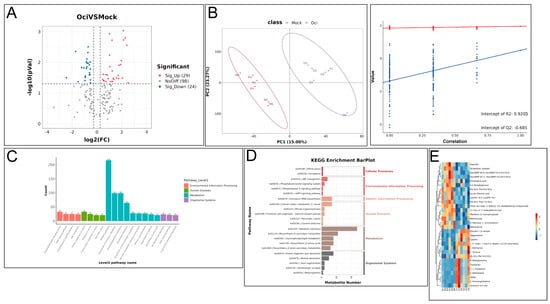 Metabolic analysis of β-ocimene-treated and untreated 98C40. (A) Volcano plot showing overall distribution of differential metabolites between β-ocimene-treated and untreated groups. (B) PCA. (C) KEGG enrichment barplot. (D) Top 20 pathways from KEGG enrichment. (E) Heatmap showing top 30 differential metabolites between β-ocimene-treated and untreated groups. Mock: control group; OCI: treated group.