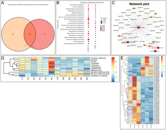 Joint analysis of transcriptomic and metabolic profiling. (A) Venn diagram showing KEGG pathways enriched with differential metabolites from each omics dataset. (B) Multi-group bubble diagrams showing pathways enriched in transcriptomic and metabolic profiling. (C) Metabolite-related sub-network diagram. (D) Heatmap showing DEGs between β-ocimene-treated and untreated 98C40 identified by transcriptomic profiling. (E) Heatmap showing differential metabolites between β-ocimene-treated and untreated 98C40 identified by metabolic profiling. Mock: control group; OCI: treated group.