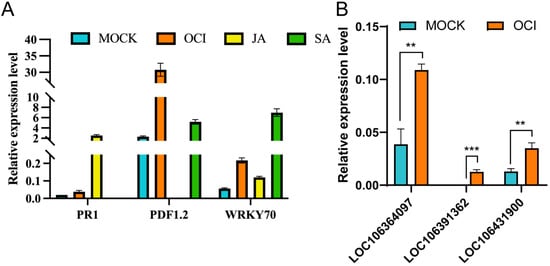 (A) RT-qPCR analysis of PR1, PDF1.2, and WRKY70 in 98C40 treated with β-ocimene, SA, and JA, respectively. (B) RT-qPCR analysis of three genes with unknown functions in 98C40 treated with β-ocimene; two-factor analysis of variance was used. The symbols **, *** indicate significant differences at the p < 0.01, p < 0.001 level. Error bars represent SD.
