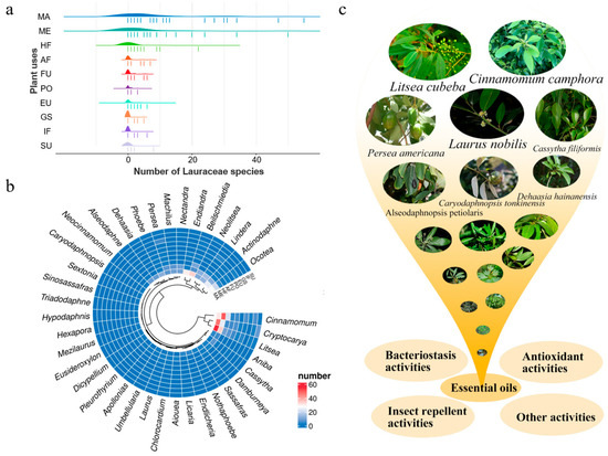 The uses of Lauraceae species. (a) The number of Lauraceae species in different plant uses. In the figure, the horizontal coordinate values corresponding to the sticks indicate the number of species in 38 genera (Actinodaphne, Aiouea, Alseodaphne, Aniba, Apollonias, Beilschmiedia, Caryodaphnopsis, Cassytha, Chlorocardium, Cinnamomum, Cryptocarya, Damburneya, Dehaasia, Dicypellium, Endiandra, Endlicheria, Eusideroxylon, Hexapora, Hypodaphnis, Laurus, Licaria, Lindera, Litsea, Machilus, Mezilaurus, Nectandra, Neocinnamomum, Neolitsea, Nothaphoebe, Ocotea, Persea, Phoebe, Pleurothyrium, Sassafras, Sextonia, Sinosassafras, Triadodaphne, Umbellularia) of Lauraceae used for the respective purposes, while the humps represent the enrichment degree. (b) Cluster analysis of plant uses in each genus of Lauraceae. The heatmap was generated using the complete-linkage hierarchical clustering algorithm and Euclidean distance metric on unprocessed data. (c) Main biological activities of the essential oils from Lauraceae plants. MA: materials (woods, fibres, cork, cane, tannins, latex, resins, gums, waxes, oils, lipids, etc. and their derived products); ME: medicines (both human and veterinary); HF: human food (food, including beverages, for humans only); AF: animal food (forage and fodder for vertebrate animals only); FU: fuels (wood, charcoal, petroleum substitutes, fuel alcohols, etc.—these have been separated from MATERIALS because of their importance); PO: poisons (plants that are poisonous to vertebrates and invertebrates, both accidentally and usefully, e.g., for hunting and fishing); EU: environmental uses (examples include intercrops and nurse crops, ornamentals, barrier hedges, shade plants, windbreaks, soil improvers, plants for revegetation and erosion control, wastewater purifiers, indicators of the presence of metals, pollution, or underground water); GS: gene sources (wild relatives of major crops which may possess traits associated to biotic or abiotic resistance and may be valuable for breeding programs); IF: inverterbrate food (only plants eaten by invertebrates useful to humans, such as silkworms, lac insects and edible grubs, are covered here); SU: social uses (plants used for social purposes, which are not definable as food or medicines, for instance, masticatories, smoking materials, narcotics, hallucinogens and psychoactive drugs, contraceptives and abortifacients, and plants with ritual or religious significance).