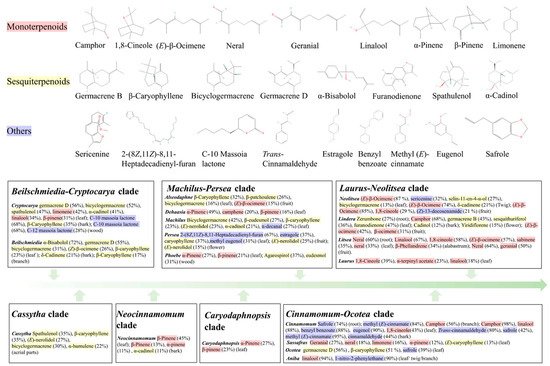 The main chemical components and structures of each genus in the Lauraceae family. The volatile components of each genus in Lauraceae are summarized from the references in Table S1, and the relative content in the figure represents the highest content of the substance that has been identified. The green arrows from left to right indicate the sequence of differentiation time in Lauraceae plants, from early to late. The pink highlights indicate monoterpenoids, the yellow highlights indicate sesquiterpenoids, and the purple highlights indicate other types of compounds.