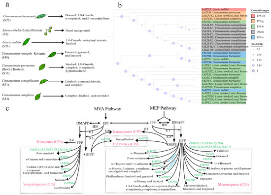 TPS genes involved in terpenoid biosynthesis have been cloned from terpene-rich plants. Based on seven publications (2004–2022), we summarized the TPS genes in the Lauraceae family. TPS genes from Cinnamomum, Litsea, and Laurus have been reported (Figure 4a), with functional analyses conducted in both Escherichia coli and allogeneic plant hosts (Table S2). The TPS genes related to terpenoid biosynthesis encompass the TPS-a, b, g, and TPS-e/f subfamilies, with the majority of reported genes belonging to the TPS-b subfamily. These genes catalyze the conversion of GPP or FPP substrates to produce single or multiple terpenes, respectively. Phylogenetic analyses (Figure 4b,c) revealed that TPS genes with distinct functions—such as those regulating the synthesis of linalool, α-thujene, nerolidol, and α-pinene—clustered into separate clades. This pattern indicates that TPS genes with similar functions exhibit high sequence homology. Additionally, while single-gene overexpression can modestly enhance target terpenoid synthesis, achieving substantial increases in final yield remains challenging [115].