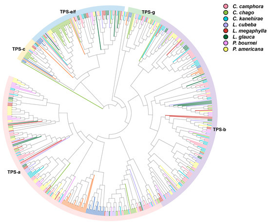 Plant genome sequencing has been carried out for many years, and the genome sequencing of Lauraceae species such as Cinnamomum camphora [97,98,99,100,101], Cinnamomum chago [102], Cinnamomum kanehirae [103], Litsea cubeba [104], Lindera megaphylla [105], Lindera glauca [106], Phoebe bournei [107], and Persea americana [108,109] has been conducted in recent years. To date, whole-genome analyses across diverse plant lineages have revealed that typical TPS genes are encoded by medium to large gene families. Except for Physcomitrella patens—whose genome contains only one TPS gene—most plant TPS gene families include 20 to 170 members. For example, Eucalyptus, Vitis vinifera, Populus tomentosa, Oryza sativa, and Arabidopsis thaliana have 113, 69, 38, 32, and 32 TPS genes, respectively.