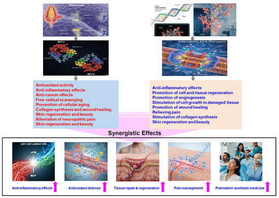 In their effects, melatonin is known to prevent cellular aging and enhance brain function while inhibiting the growth of cancer cells [48,49,50,51,52,53,54,55,56,57,58,59,60,61,62,63,64,65,102,103,104,105,106,107,128,141,142,143,144,145,146,147,148,149,150,151,152,153]. PDRN, on the other hand, promotes the growth of damaged tissue and increases the secretion of fibroblasts and growth factors, thereby facilitating tissue regeneration across a broad range of conditions [5,73,77,85,86,87,88,90,95,108,111,113,114,115,116,117,118,121,123,154,155,156,157,158,159,160,161].