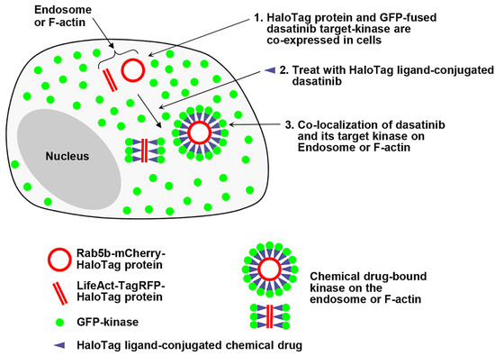 A schematic illustration of the strategy: Live cell monitoring of the chemical drug binding to its target protein is performed within spatially localized intercellular compartments, such as endosomes or F-actin. (1) HeLa cells are co-expressed with a HaloTag fusion protein localized to the surface of endosomes (or F-actin) and with a green fluorescent protein (GFP)-fused dasatinib–target kinases. (2) These cells are then treated with a HaloTag ligand-conjugated dasatinib, and (3) the co-localization of the chemical drug and its target kinases is observed in endosomes (or F-actin).