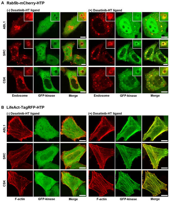 After confirming the cellular uptake and affinity of dasatinib−HT ligand and verifying spatially localized HTP expression, we obtained images of its binding to cytoplasmic target kinases in live cells. The target kinases of dasatinib (ABL1, BLK, BMX, BTK, CSK, FGR, HCK, LYN, SRC, and YES1) were cloned into an EGFP vector (Table S1) [22]. Rab5b−mCherry−HTP (or LifeAct−TagRFP−HTP), and each GFP−fusion kinase was transiently co-expressed in HeLa cells. HTP was expressed in intracellular compartments, such as endosomes and F-actins, while the GFP-fusion kinase was expressed in the cytoplasm (Figure 3, left panel, and Figures S4 and S5, left panels). The cells were treated with dasatinib−HT ligand for 1 h in a serum-free medium (final concentration: 1 M, 0.1% DMSO). As shown in Figure 3 (right panel), the GFP-fusion kinase co-localized with the intracellular compartments (Figures S4 and S5, right panels). This assay employs two distinct protein constructs: a bait protein localized to either endosomes or F-actin via an SLP tag and a cytosolic prey protein consisting of a GFP-fused kinase. Upon treatment with the HT ligand-conjugated chemical drug, the GFP−fusion kinase is recruited to endosomes (or F-actin), indicating an interaction between the chemical drug and its target proteins. Successful recruitment is visualized by the appearance of green circles (for endosomes) and lines (for F-actin), reflecting the specific localization of the bait protein. For a negative control experiment, GFP and Rab5b−mCherry−HTP (or LifeAct−TagRFP−HTP) were co-expressed in HeLa cells (Figure S6, left panel). The cells were treated with dasatinib−HT ligand (1 µM) for 1 h in a serum-free medium. GFP was not co-localized with the intracellular compartments (Figure S6, right panel), indicating the absence of nonspecific interactions between the dasatinib and GFP. To further validate the specificity of the dasatinib−HT ligand binding, competition assays were performed using excess dasatinib. The binding signal (green circles (on endosomes) and lines (on F-actin)) between dasatinib−HT ligand and GFP−ABL1 was decreased substantially by brief co-incubation with an excess of dasatinib (10 µM) in the same cells (Figure 4). Overall, these results clearly show that our assay can be used to visualize the interaction between a chemical drug and its target proteins in living cells using a GFP-labeled protein library.