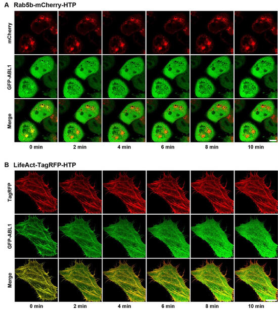 Dasatinib-mediated inhibition of binding between dasatinib−HT ligand and GFP−ABL1 on the endosome (A) and F-actin (B) in the same cells. All scale bars are 10 μm.