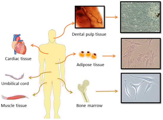Currently, MSCs are the most frequently utilized cells in cell therapies for various pathological and regenerative tissue conditions due to their proliferative potential, differentiation capabilities, immunomodulatory properties, and ease of acquisition []. MSCs are adult, multipotent stem cells that can be derived from a variety of tissues, including the bone marrow, adipose tissue, umbilical cord, dental tissues, placenta, and skeletal muscles (Figure 1) [].