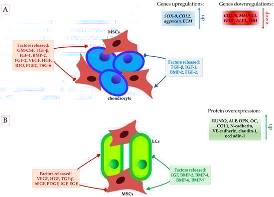 Crosslink between various types of cells in cartilage and bone regeneration. (A) Proteins released by direct co-culture of chondrocytes and MSCs in cartilage regeneration. (B) Active factors released by MSCs and ECs in direct co-culture model, promoting angiogenesis and enhancing osteogenic potential of MSCs during bone regeneration.