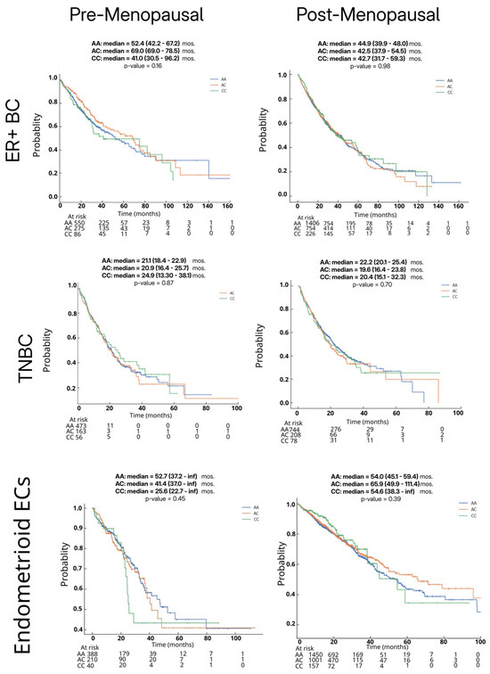 We evaluated the overall survival (OS) across ER + BC, triple-negative BC (TNBC), and endometrioid EC, stratified by the HSD3B1 genotype (AA vs. AC vs. CC) and inferred menopausal status. The median OS (in months) was compared using the Kaplan–Meier analysis. Survival curves for non-endometrioid EC could not be generated due to an insufficient sample size.