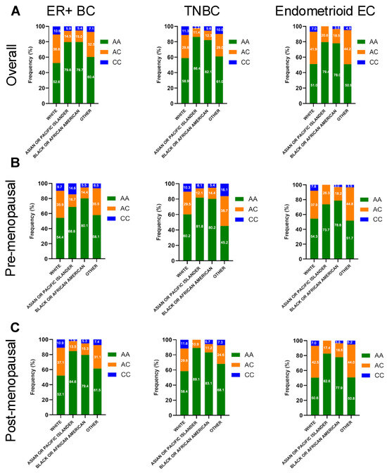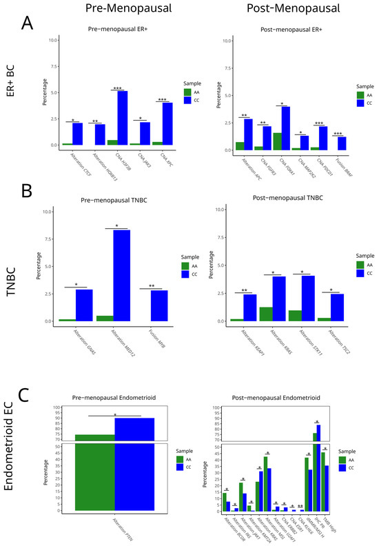 Frequency of genomic alterations in germline HSD3B1 AA vs. CC tumors distributed by race across pre- and postmenopausal ER + BC, TNBC, and endometrioid EC cases. (A) Distribution across overall population, (B) Distribution across pre-menopausal population, (C) Distribution across post-menopausal population. Bar plots display percentage of tumors with specific alterations across genotype. See more details in Supplementary Tables S1 and S2.