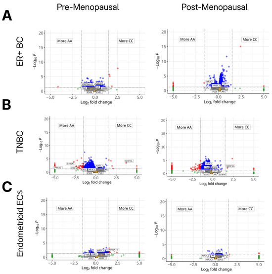 To investigate the potential tumor-intrinsic effects of the HSD3B1 genotype, we performed differential gene expression analyses comparing BC and EC tumor subtypes that harbor either the CC or AA genotypes. Similar to our prior genomic analysis, tumors with the heterogeneous AC genotype were excluded. In ER + BC tumors, across HSD3B1 genotypes in both pre- and postmenopausal tumors, there was minimal variation in the transcriptome, including in the expression of canonical hormone receptor genes (ESR1, ESR2, PGR) (Figure 4, and Supplementary Table S4). In TNBC, transcriptional differences between HSD3B1 genotypes were overall more pronounced. In premenopausal TNBC, tumors harboring the CC genotype had reduced expression of inflammatory genes, like S100A7 and LY6D [14,15] (p-values = 0.0006 and = 0.0052, respectively), and basal-like genes, such as SPRR2G [16] (p-value = 0.0039). Furthermore, in both pre- and postmenopausal TNBC, we noted that SERF1A, a gene with no known function and part of a gene signature used to estimate the likelihood of BC recurrence [17], was upregulated in the CC genotype (p-value = 0.0004 and 0.0083, respectively). Hormone-related genes, like ESR2 and NR3C2 (encoding the mineralocorticoid receptor), showed no significant differential expression between genotypes across inferred menopausal statuses in TNBC (Figure 4B and Supplementary Table S4). In endometrioid ECs, HSD3B1 genotypes differed in expression in only a few genes. Across both menopausal statuses, there were no significant differences in canonical hormone receptor genes. In pre- but and not postmenopausal tumors, the CC genotype harbored the increased expression of CSNS1, in which high expression has been associated with worse survival outcomes in BC [18] and SERPINA11, which has been implicated in tumor suppression in hepatocellular carcinoma [19] (Figure 4C and Supplementary Table S5). Overall, transcriptional variation dependent on HSD3B1 genotypes differed by the cancer type, with the majority of differences seen in TNBC and less variation observed in ER + BC and endometrioid EC.