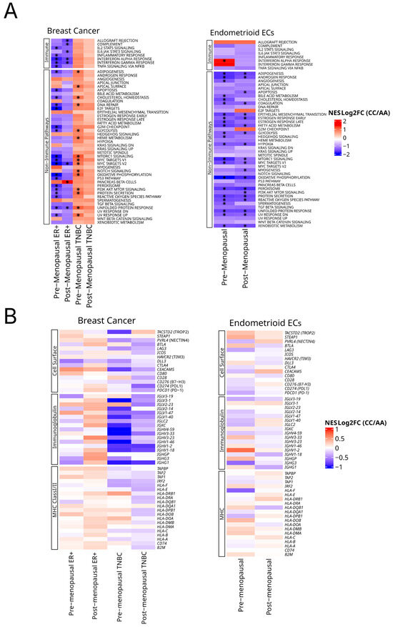 Pathway and gene expression analysis across germline HSD3B1 genotypes. (A) Gene set enrichment analysis (GSEA) of 50 hallmark pathways reflecting enrichment in CC vs. AA. This is stratified by tumor type and inferred menopausal status. Hallmark pathways are grouped by immune and non-immune signaling in BC and EC. Heatmaps represent normalized enrichment scores (NES) with asterisks indicating FDR of <0.05. See Supplementary Tables S6 and S7 for further details. (B) Relative expression of cell surface, immunoglobin and MHC class I/II gene pathways as grouped by BCs and ECs.