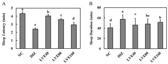Lemon verbena ethanol extract (LVE) modulates sleep latency and duration in pentobarbital-injected mice. (A) Sleep latency (min); (B) sleep duration (min). NC, normal control; DIZ, Diazepam 2 mg/kg b.w.; LVE 40, LVE 40 mg/kg b.w.; LVE 80, LVE 80 mg/kg b.w.; LVE 160, LVE 160 mg/kg b.w. Oral administration for each group was continued for 2 weeks. Data are presented as mean ± standard deviation (SD). Statistical significance was determined using one-way ANOVA followed by post hoc test. Different letters (a, b, c, d, e) above bars indicate significant differences between groups (p < 0.05).