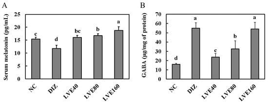 Lemon verbena ethanol extract (LVE) improves serum melatonin levels and Brain GABA concentrations in pentobarbital-injected mice. (A) Serum melatonin; (B) GABA concentration. NC, normal control; DIZ, Diazepam 2 mg/kg b.w.; LVE 40, LVE 40 mg/kg b.w.; LVE 80, LVE 80 mg/kg b.w.; LVE 160, LVE 160 mg/kg b.w. Oral administration for each group was continued for 2 weeks. Data are presented as mean ± standard deviation (SD). Statistical significance was determined using one-way ANOVA followed by post hoc test. Different letters (a, b, c, d) above bars indicate significant differences between groups (p < 0.05).