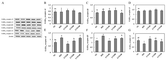 To assess the effect of LVE intake on GABAA receptor expression, the mRNA expression of the subunits (α1, α2, β1, β2, γ1, and γ2) in the brains of the pentobarbital-injected mice was measured. The mRNA expression of GABAA receptor α1 in the LVE-administered groups (40, 80, and 160 mg/kg b.w.) was comparatively higher than that in the DIZ group; however, no statistically significant differences were observed among all groups (Figure 4B). The mRNA expression of GABAA receptor α2 in the LVE-administered groups (40, 80, and 160 mg/kg b.w.) was significantly decreased compared to the DIZ group (Figure 4E). Moreover, no statistically significant differences were observed in the mRNA expressions levels of GABAA receptor β1 and γ1 among all groups (Figure 4C,D). The mRNA expression of GABAA receptor β2 in the DIZ group was significantly increased compared to the NC group. However, LVE treatment inhibited the mRNA expression of GABAA receptor β2 compared to the DIZ group (Figure 4F). The mRNA expression of GABAA receptor γ2 in the DIZ group was significantly decreased compared to the NC group. In the LVE-treated groups, the mRNA expression of GABAA receptor γ2 was increased compared to the DIZ group (Figure 4G).