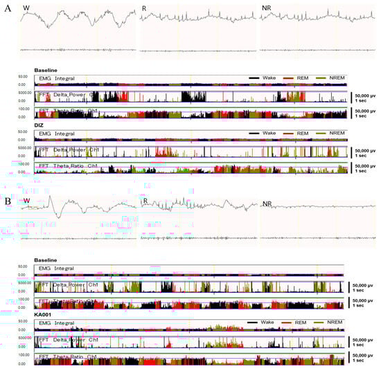 Changes in sleep duration following each sample intake were analyzed through quantitative EEG/EMG analysis (Figure 6). The wake time in the DIZ, KA001, KB002, and KC003 groups was significantly reduced compared to baseline (p < 0.001), with KA001 showing a significant increase in both REM and NREM sleep durations compared to baseline (p < 0.001). The NREM sleep duration in the DIZ, KB002, and KC003 groups was significantly increased compared to baseline, although no significant differences were observed in REM sleep duration (Figure 7A). When the baseline EEG quantitative analysis values were set as 100%, the wake time in the DIZ, KA001, KB002, and KC003 groups decreased by 60.2%, 52.8%, 55.9%, and 55.4%, respectively (p < 0.001). Notably, KA001 and KB002 showed significant increases in REM sleep time by 73.6% and 44.3%, respectively, and in NREM sleep time by 110.7% and 194.5%, respectively. While DIZ and KC003 exhibited significant increases in NREM sleep time by 147.1% and 154.7%, respectively (p < 0.001), no significant differences were observed in REM sleep duration (Figure 7B).