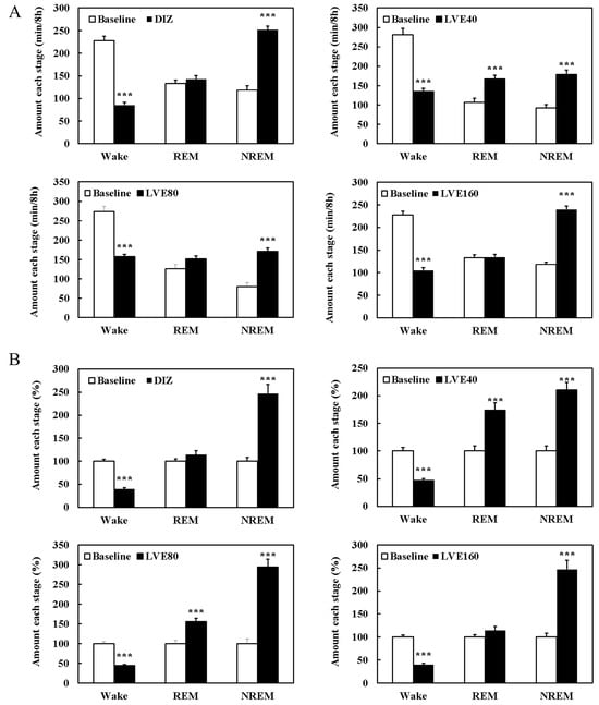 Sleep stage (wake, REM, NREM) duration and its percentage distribution in quantitative EEG analysis. (A) Amount each stage (min/8 h). (B) Amount each stage (%). Oral administration for each group was continued for 7 consecutive days. EEG recordings were performed for an additional 24 h. Student’s t-test was used for comparisons between baseline and each treatment group. Statistical significance is indicated by *** (p < 0.001).
