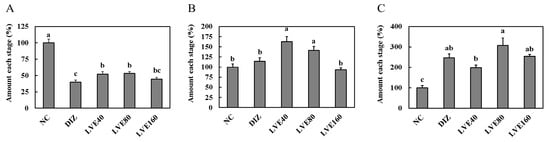To assess the effect of oral LVE administration on sleep latency and duration, these parameters were measured in the pentobarbital-injected mice using the righting reflex test. Mice administered with DIZ and LVE exhibited a notable reduction in sleep latency compared to the NC group (p < 0.05; Figure 2A). The LVE 160 high-dose group showed a similar effect in reducing sleep latency as observed in the DIZ group. Additionally, LVE’s administration significantly prolonged the sleep duration in pentobarbital-injected mice compared to the NC group (p < 0.05; Figure 2B). The LVE 160 high-dose group also increased their sleep duration at a level similar to that observed in the DIZ group.