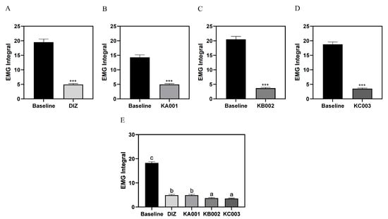 Group-wise comparison of sleep duration on quantitative EMG integral analysis. (A) Diazepam 2 mg/kg/day (DIZ); (B) LVE 40 mg/kg/day (KA001); (C) LVE 80 mg/kg/day (KB002); (D) LVE 160 mg/kg/day (KC003); (E) group-wise comparison. Oral administration for each group was continued for 7 consecutive days. EMG recordings were performed for an additional 24 h. Data are presented as mean ± standard deviation (SD). Statistical significance was assessed using Student’s t-test for comparisons between baseline and treatment samples (*** p < 0.001). For comparisons among multiple groups, one-way ANOVA followed by a post hoc test was performed. Different letters (a, b, c) above the bars indicate significant differences between groups (p < 0.05).