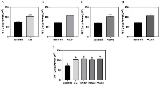 Group-wise comparison of sleep duration on quantitative FFT delta power analysis. (A) Diazepam 2 mg/kg/day (DIZ); (B) LVE 40 mg/kg/day (KA001); (C) LVE 80 mg/kg/day (KB002); (D) LVE 160 mg/kg/day (KC003); (E) group-wise comparison. Oral administration for each group was continued for 7 consecutive days. Data are presented as mean ± standard deviation (SD). Statistical significance was assessed using Student’s t-test for comparisons between baseline and treatment samples (*** p < 0.001). For comparisons among multiple groups, one-way ANOVA followed by a post hoc test was performed. Different letters (a, b) above the bars indicate significant differences between groups (p < 0.05).