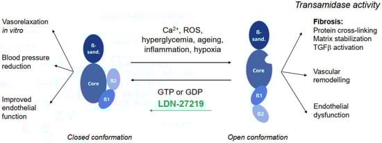 Extracellularly, the open conformation is involved in the Ca2+-dependent crosslinking of both glutamine with lysine residues, following the prior deamination of glutamine [,]. This results in protein crosslinking, leading to extracellular matrix stabilization and thus contributing to fibrosis development []. Furthermore, TG2 crosslinking is involved in transforming growth factor beta (TGFβ) release and activation, which exacerbates fibrosis []. In addition, TG2 transamidase activity has been associated with vascular remodeling [] and endothelial dysfunction []. In this regard, the transamidase activity of TG2 is considered a sign of cellular stress, and stimuli like increased extracellular glucose levels [], reactive oxygen species, and inflammatory cytokines [] have been shown to increase it.