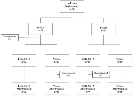 A flow chart describing the fate of the 48 mice subjected to nephrectomy is shown in Figure 2. In the DOCA group, three mice died before the start of treatment. Three mice from the DOCA vehicle arm were euthanized or found dead during treatment. In the sham group, one mouse in the LDN-27219 arm died during the treatment period.
