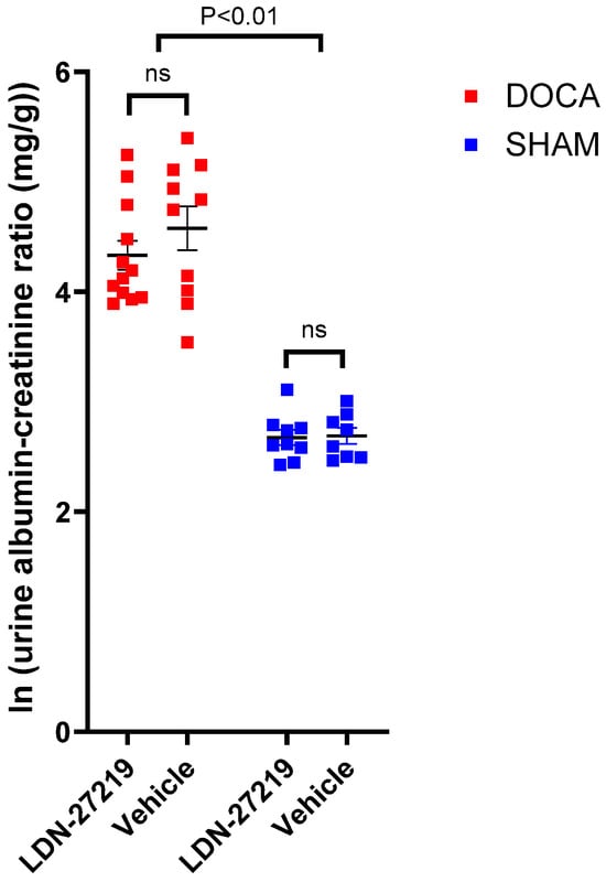 Urine albumin/creatine ratio (logarithmically transformed) for DOCA mice treated with LDN-27219 (n = 12) or vehicle (n = 10) and sham mice treated with LDN-27219 (n = 9) or vehicle (n = 10). Data were analyzed with 2-way ANOVA and are expressed as mean ± SEM. ns = non significant.
