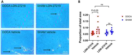 Figure 4A shows representative examples of Picrosirius staining. Although there was no overall difference between DOCA and sham groups concerning the degree of Picrosirius red staining, we observed a lower collagen deposition in the LDN-27219-treated as compared to vehicle-treated in the DOCA mice (Figure 4B).