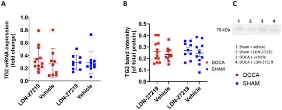 We found no difference in TG2 mRNA expression (Figure 5A) or protein expression (Figure 5B) between DOCA and sham animals, and LDN-27219 had no effect on these parameters. Figure 5C shows representative Western blot examples.